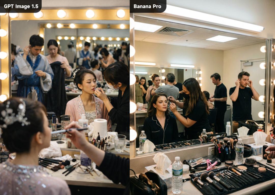 Prompt:生成一张照片级真实抓拍:演出后台化妆间。 场景: 一排带灯泡的化妆镜,桌面有散乱的化妆刷、发夹、水杯、纸巾; 光源为镜前灯泡(暖)+室内顶灯(中性),混合光真实。 主体: 至少6位演员/工作人员: 前景:一位坐着化妆,化妆师在旁边补妆(手部动作清楚); 中景:两位在整理衣服与耳返; 镜子里必须能看到与现实一致的反射(人数、姿态、位置匹配,不能凭空多出人或少人)。 摄影参数/构图: 50mm,f/1.8,1/160s,ISO 2500;中近景;浅景深。