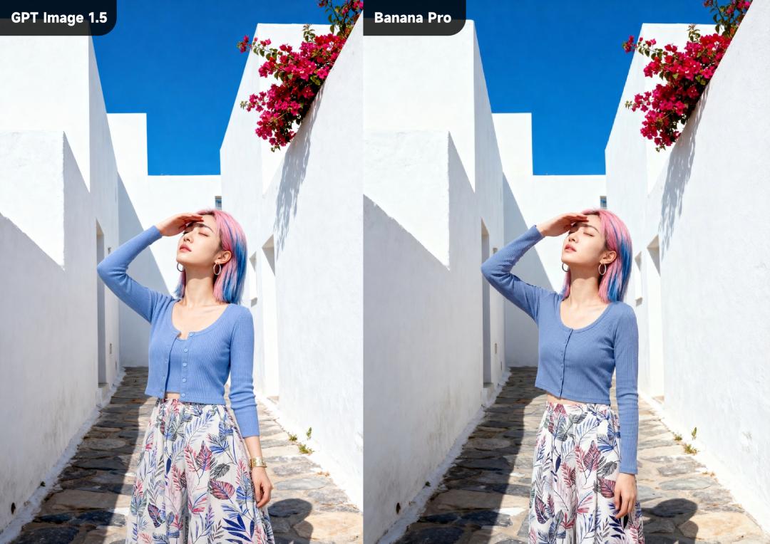 有一说一,这张整体的构图和感觉,我觉得GPT更好一点,GPT只丢了镜前这一个信息,但是Banan Pro丢了顶视角和镜前两个信息,而且姿势也没那么夸张。
