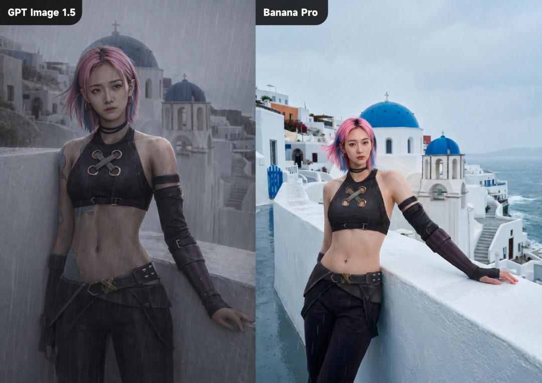 虽然Banana的人脸保持也有一点问题,不太像了,但是整体肯定是比GPT要好的,我只替换服装,然后下雨,没让你把画风和色调也迁移过去啊。