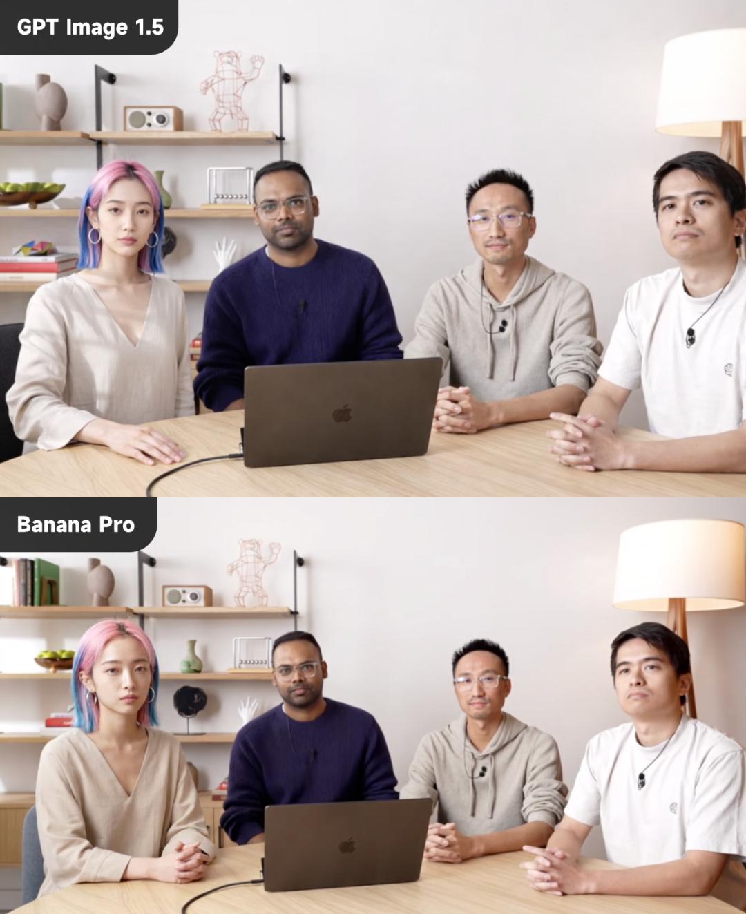 从光影感觉,人物比例和透视,Banana Pro更胜一筹,第一个的燃夏身上的衣服的光影明显就不对,然后明明是个圆桌,染夏是更靠近镜头的,所以肯定会显得大一点,原来的奥特曼也是这样,这就是最基本的近大远小。