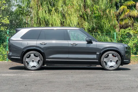 车身侧面同样惊艳,悬浮式车顶搭配22英寸轮毂(Hyper版标配),比例协调得恰到好处。特别是寰宇天地门设计,前门开启角度接近90度,后门采用电动滑移结构,上下车时完全不用弯腰低头,这种仪式感在同级别里几乎没有。尾部的贯穿式尾灯与车头大灯形成呼应,点亮时的流水效果很有辨识度,配合下方的扩散器造型,运动感和豪华感平衡得刚好。