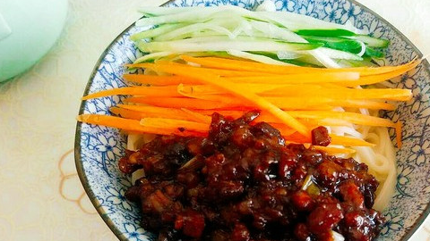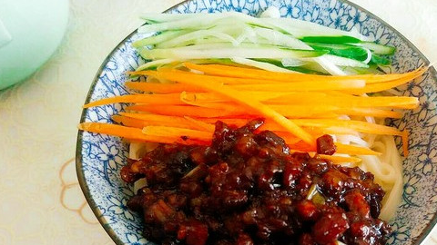 14.面条煮熟后过冷水装碗,将胡萝卜丝黄瓜丝分别码在面上,舀上适量酱即可。