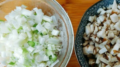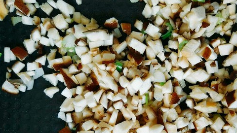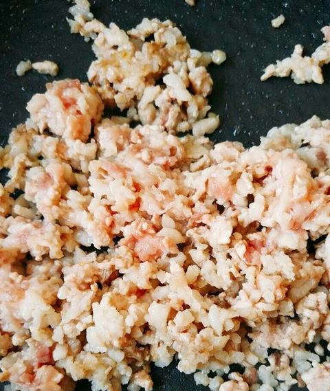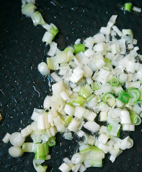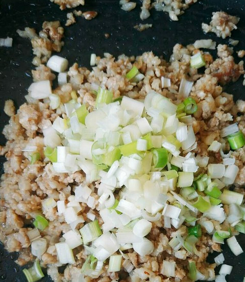 10..猪肉丁变色后加入剩下的葱花翻炒。