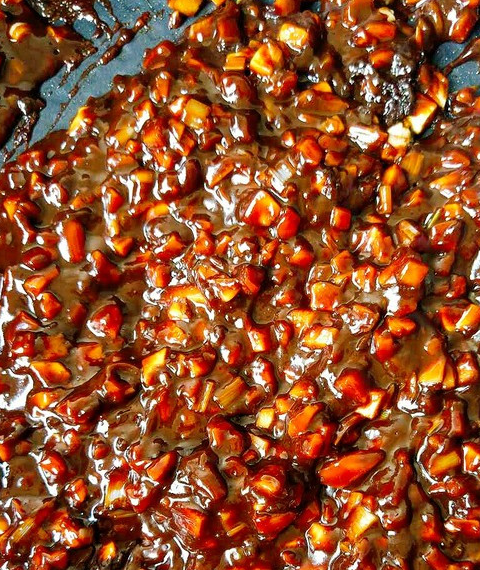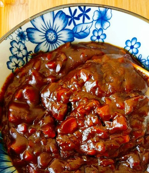 11.将熬好的酱倒入锅中,和猪肉丁翻炒均匀后小火咕嘟5分钟即可。