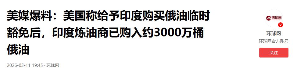 环球网2026-03-11:《美媒爆料:美国称给予印度购买俄油临时豁免后,印度炼油商已购入约3000万桶俄油》