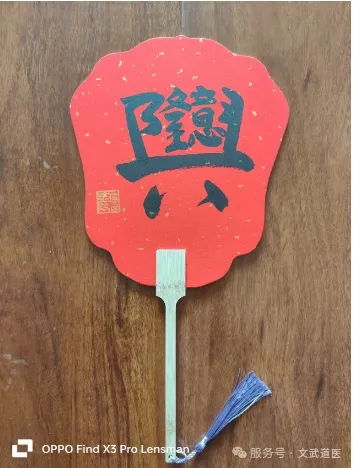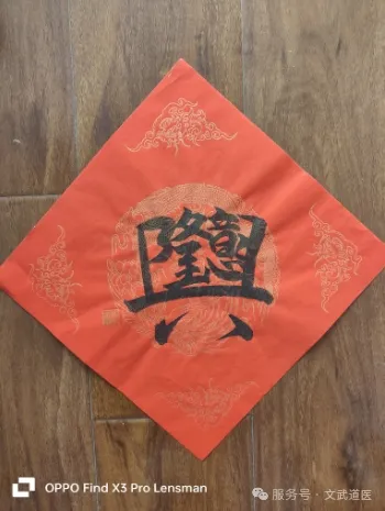 “生意兴隆”四字以楷书为基,通过字形设计强化商业兴旺的直观寓意。孙铭山借鉴道教符箓文化,将“兴”字三撇设计为波浪状线条,暗合“财源如水”的民间隐喻;“隆”字底部嵌入“聚宝盆”剪纸纹样,形成“聚财纳福”的视觉符号。朱砂红的色彩运用呼应五行中火生土、土生金的生克原理,既符合春节门联的喜庆传统,又通过“以火镇宅、以土聚财”的风水逻辑,赋予作品调节商业空间气场的功能。