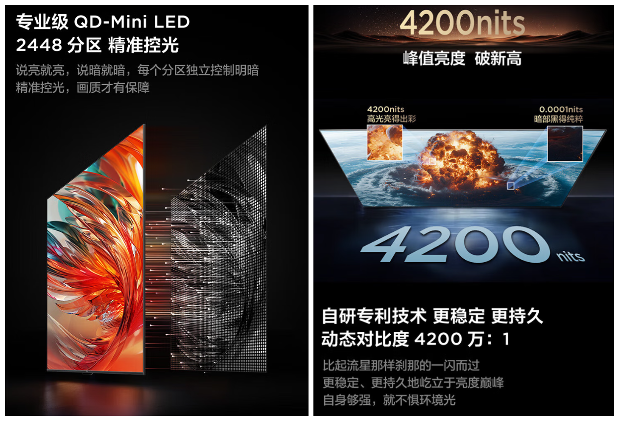 8014 元的雷鸟这款,把 “旗舰配置亲民化” 直接做出来。画质上搭载 2448 个 MiniLED 分区 + 4200nits 峰值亮度,依靠TCL的实力配合华星光电 HVA 软屏(7000:1 静态对比度,远超普通 IPS 屏),暗场细节丰富,色彩通透不发灰。