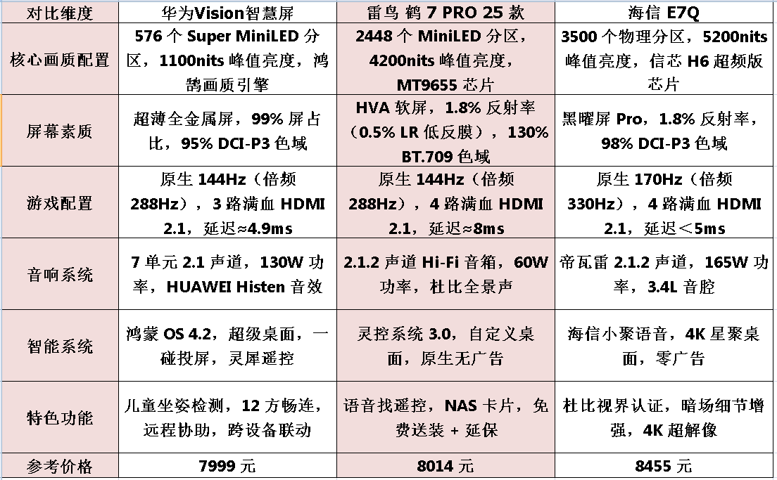 三款机型都是 85 寸 MiniLED 的 “闭眼入” 款,差价不大但定位清晰:华为 Vision 智慧屏 5 Pro 的核心优势是鸿蒙生态和智慧交互,全家使用更适配;雷鸟鹤 7 PRO 25 款赢在性价比和无套路,适合务实派用户;海信 E7Q 胜在画质和游戏硬实力,是追求极致体验的首选