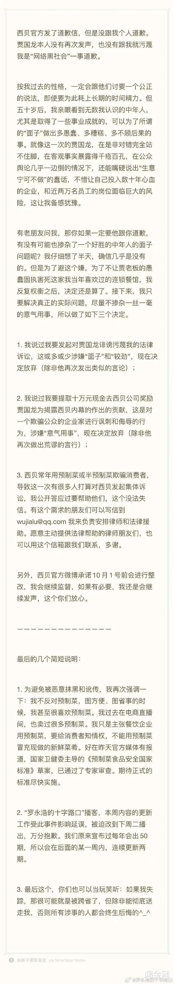 老罗自称不希望看到近两万人员工的岗位面临巨大风险,犹豫之下决定算了,放弃起诉贾国龙,也不会带着10万现金去西贝总部讽刺贾国龙,除非他再干蠢事。不过最后,老罗依然保留了对西贝发起集体诉讼的权利,他透露这是大批被西贝欺骗的网友的诉求,如果有网友有需求他会提供法律援助。