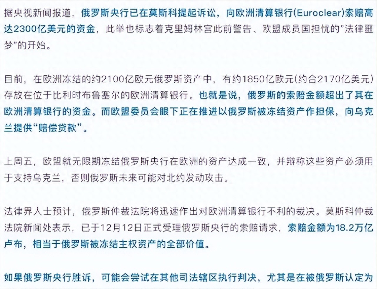 2025年12月12日,俄罗斯央行正式向莫斯科仲裁法院递交了起诉书,对Euroclear索赔18.2万亿卢布。这笔钱换算成美元,大概2290亿左右,正好对上被冻的资产总额。俄罗斯说Euroclear违反了托管协议,不该受政治影响冻结客户财产。法院很快就受理了,估计审理不会拖太久。俄罗斯央行准备了大量证据,包括合同细节和冻结记录。Euroclear那边可能不认莫斯科的管辖,但俄罗斯不在乎,先在本土打官司,赢了再说执行的事儿。