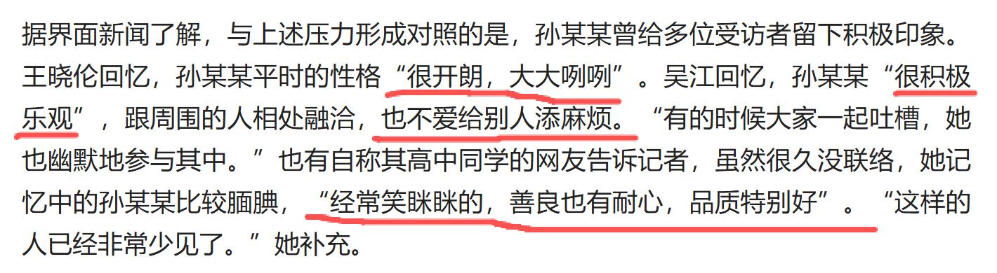 从孙某某同学和同事说的话来看,她应该是个不爱给别人添麻烦的女生,可能正是因为这个性格,很多情绪她都自己消化,自己扛着。