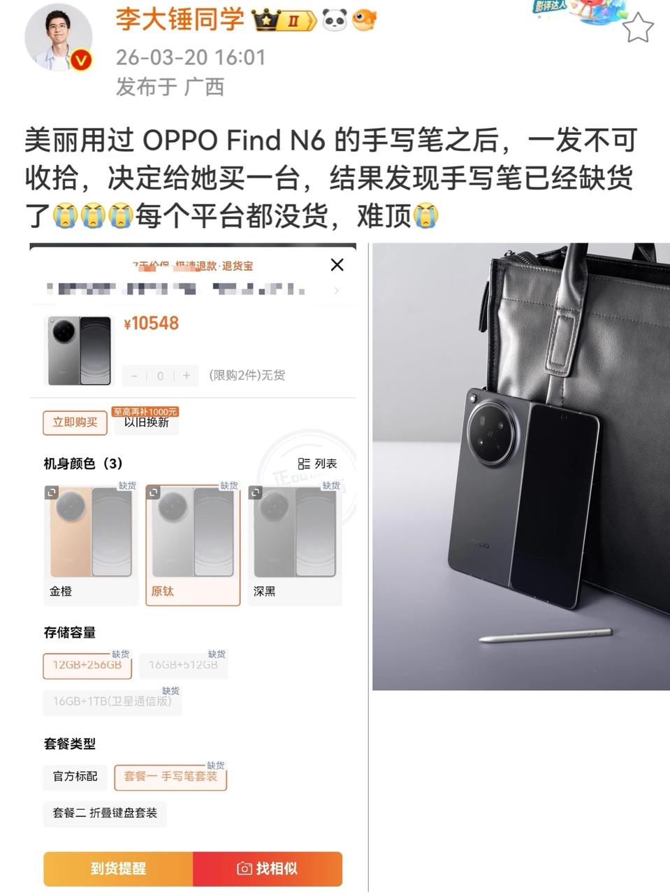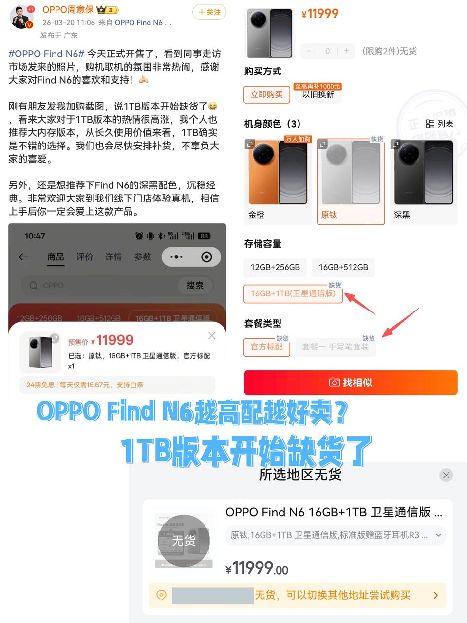 不然很容易像我一样昨天还在纠结要不要入手1TB版的Find N6,结果今早打开某宝一看直接没货了😭看到刘作虎和周意保都发围脖说了这次Find N6的1TB卖得特别好,很多人都选择一步到位,属于是越高配的越好卖~