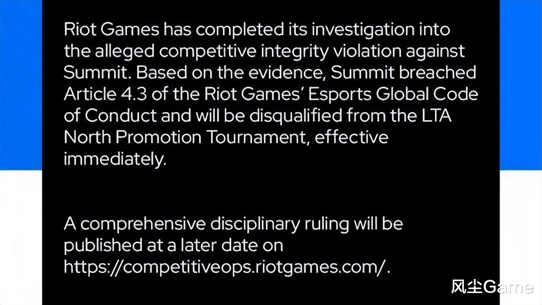 TheShy高中同学Summit,最近在征战LCS赛区升降赛,在交手DSG的比赛里,因为遭到网络攻击,比赛一度暂停超过5个小时,期间Summit选手,打开官方比赛直播间,被观众当场逮捕,官方以作弊为由对其禁赛调查,在调查了一天之后,LCS官方发文宣布:取消Summit的参赛资格。