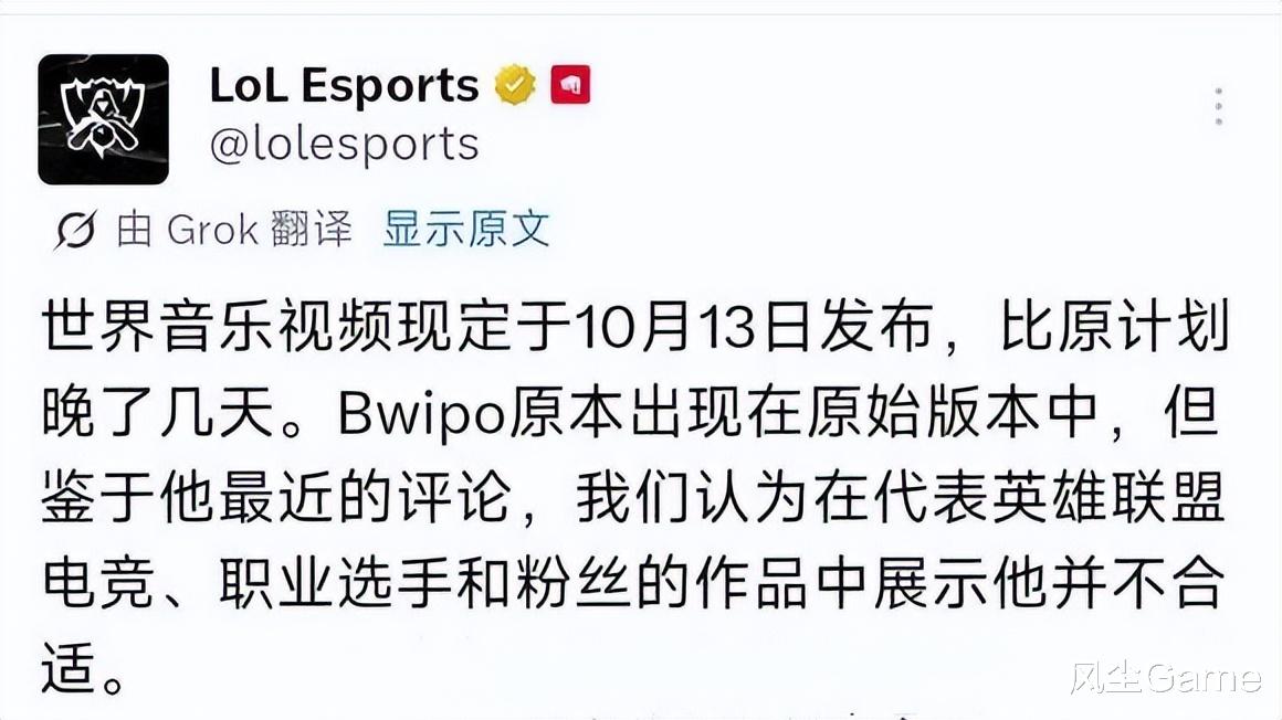 Bwipo是代表LCS赛区,收录进主题曲MV的,结果一番正常的发言,引发了巨大的争议,看来国外的拳师们,战斗力也不低啊,上个月的事情,现在还在讨论,甚至影响到世界赛主题曲上线时间,只能说选手真得谨言慎行啊。