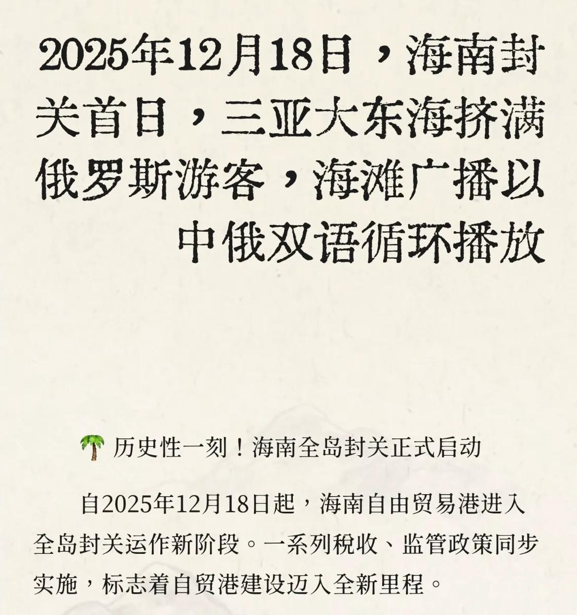 总结来说,海南封关首日三亚大东海的热闹场面,就是政策给力、气候诱人、服务到位凑一块儿的结果。免签政策加上直航恢复,让俄罗斯朋友来三亚跟串门似的方便;三亚冬天暖和,对比老家零下10℃的严寒,简直是避寒天堂;再加上双语广播、俄语提示牌这些贴心安排,人家玩得舒心,自然就扎堆来了。