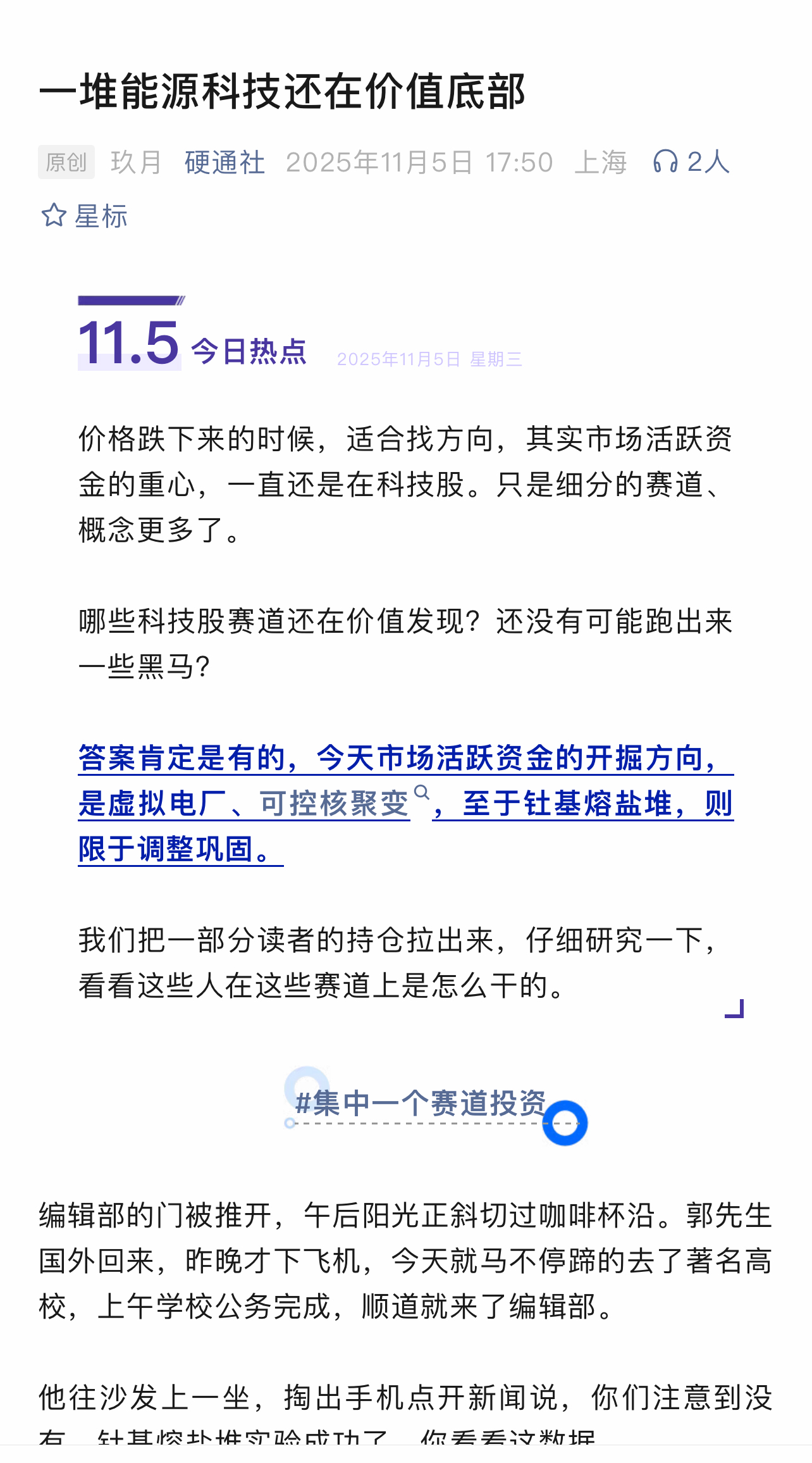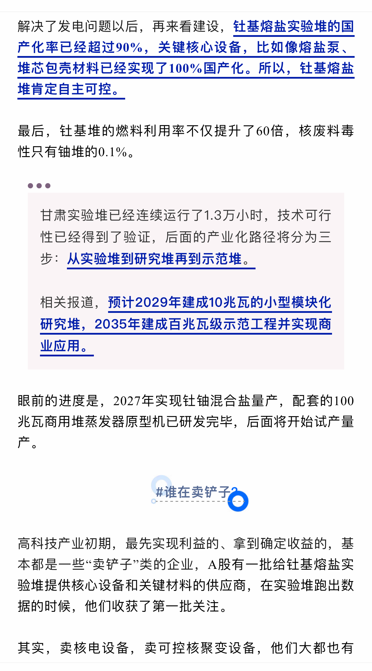 最近能源非常活跃,不管是钍基熔盐还是核聚变,还是虚拟电厂,反正能源在这一轮已经开始摒不牢了。钍基盐熔堆这个赛道的时间不是一般的长,而且我觉得它不一定那么快规模化,因为它始终还是核电,它始终还是有核废料,哪怕毒性再低,环评那么好通过吗?大肆建堆,合适吗?感觉没有那么容易的。所以,虚拟电厂感觉要跑的更快一点,业务模型更轻不是吗?把别人付过钱的电收集起来再利用,只需要一套系统,就可以实现电量的再分发。还有,可控核聚变是一点核废掉都没有的哦。总而言之,应该看到的是,能源赛道蠢蠢欲动。