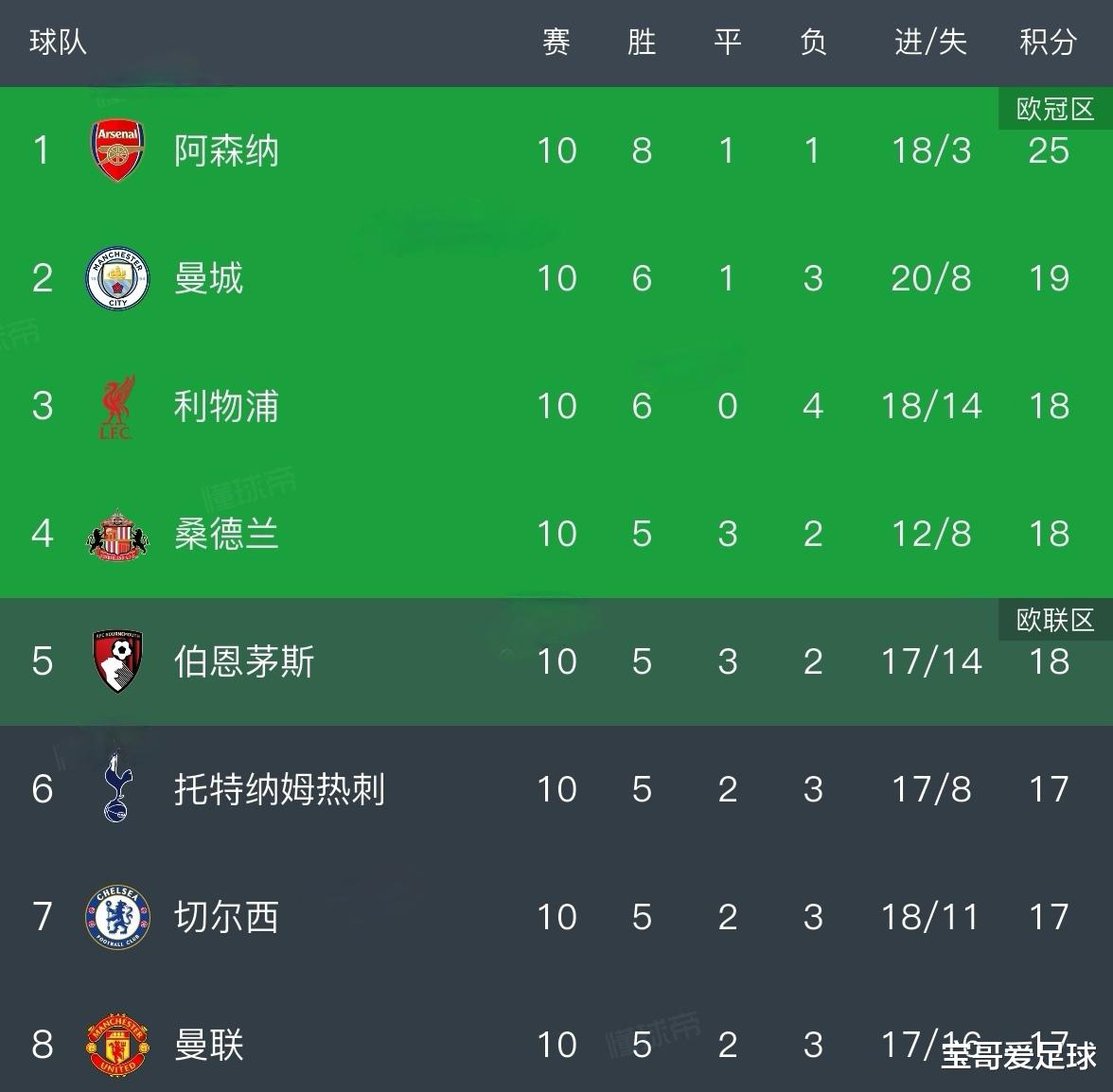 随着桑德兰在主场1-1战平埃弗顿重新进入英超前四名,英超第10轮的比赛已经全部结束。目前英超积分榜上,阿森纳以25分排名第一,且已经领先第二名曼城6分之多,以阿森纳本赛季的人员配置和状态,争冠大战几乎没有什么对手。而在阿森纳之后,从第2名曼城到第11名阿斯顿维拉这10支队伍都有可能进入本赛季英超前四行列,英超的争四大战将会异常惨烈。特别夸张的是第2名曼城和第8名曼联仅仅相差了2分,一场比赛过后,积分榜前列的排名可能就会发生天翻地覆的变化。