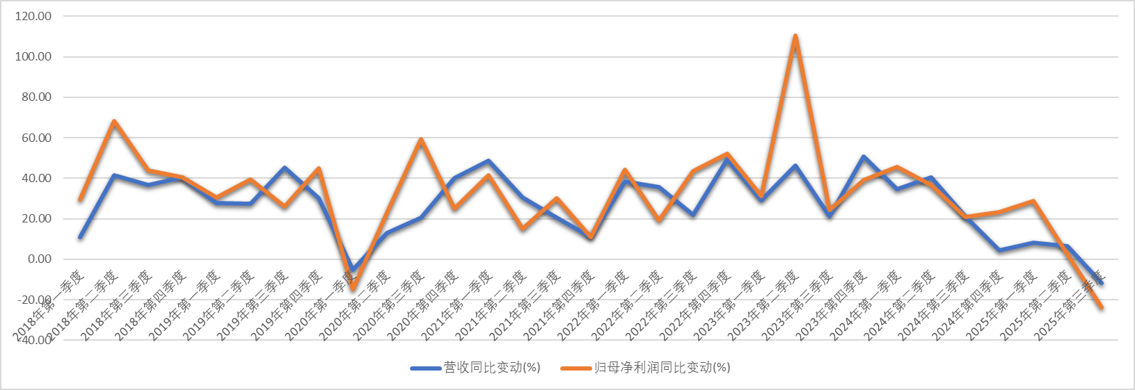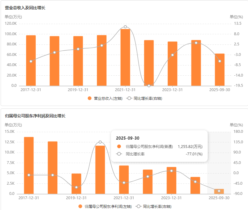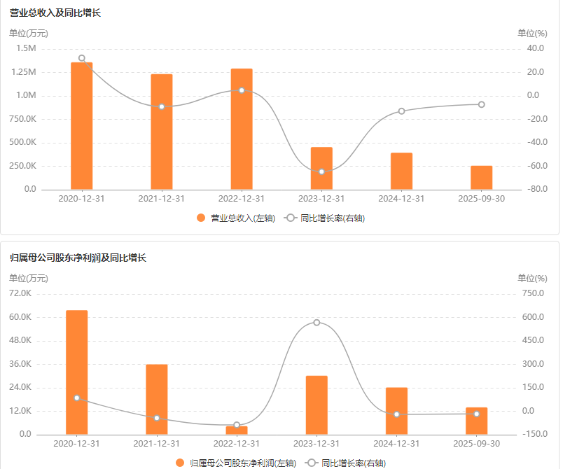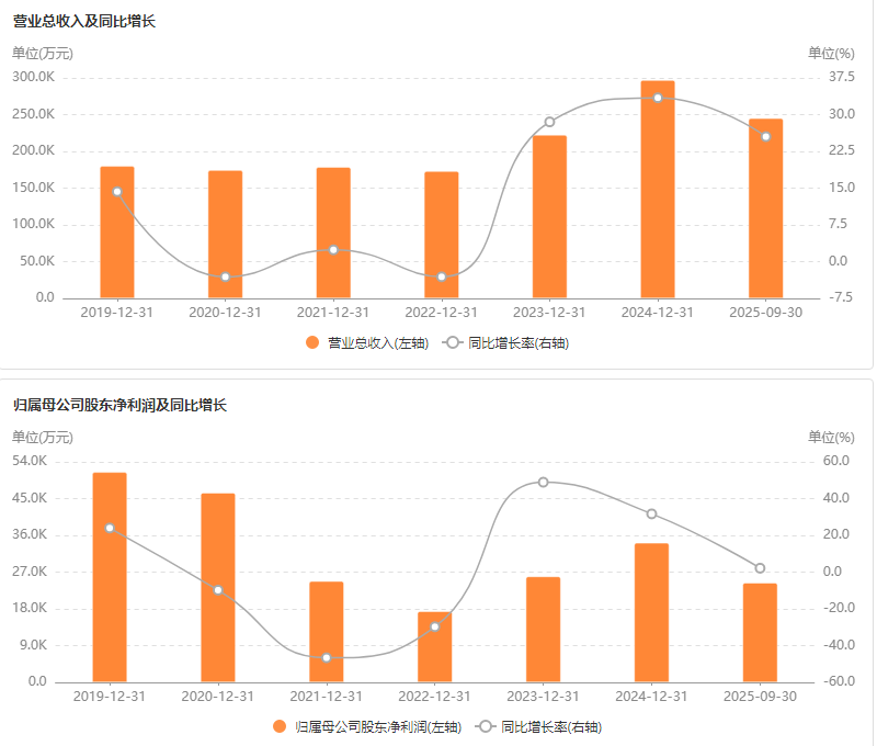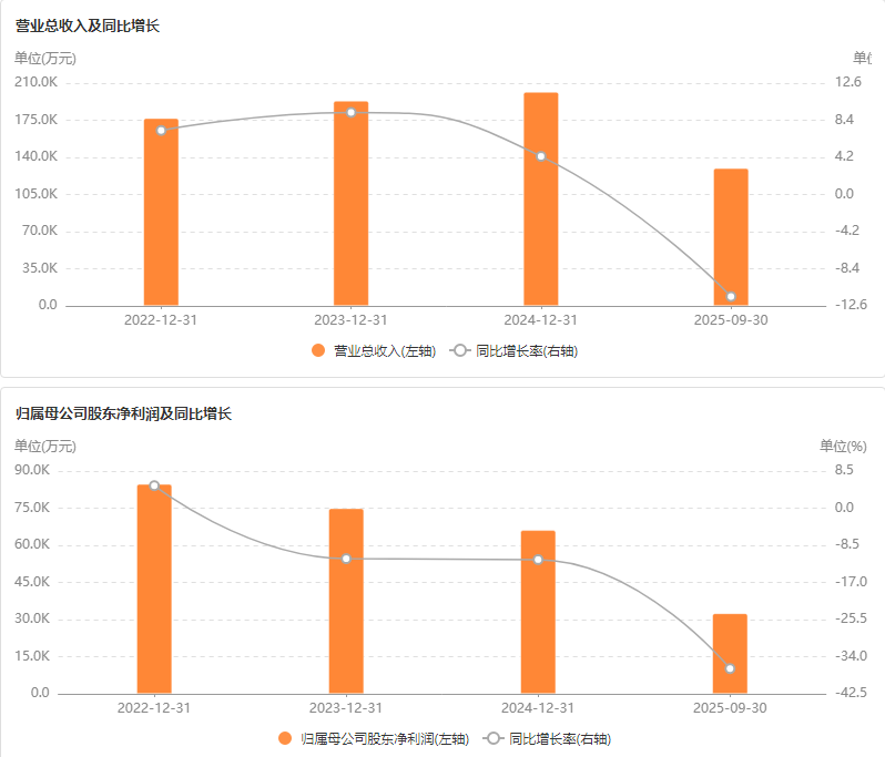 2025年前三季度,公司营收同比下滑11.54%至12.97亿元,净利润大降36.73%至3.25亿元;其中第三季度营收同比跌17.58%至4.34亿元、净利润同比降44.96%至9538.69万元。