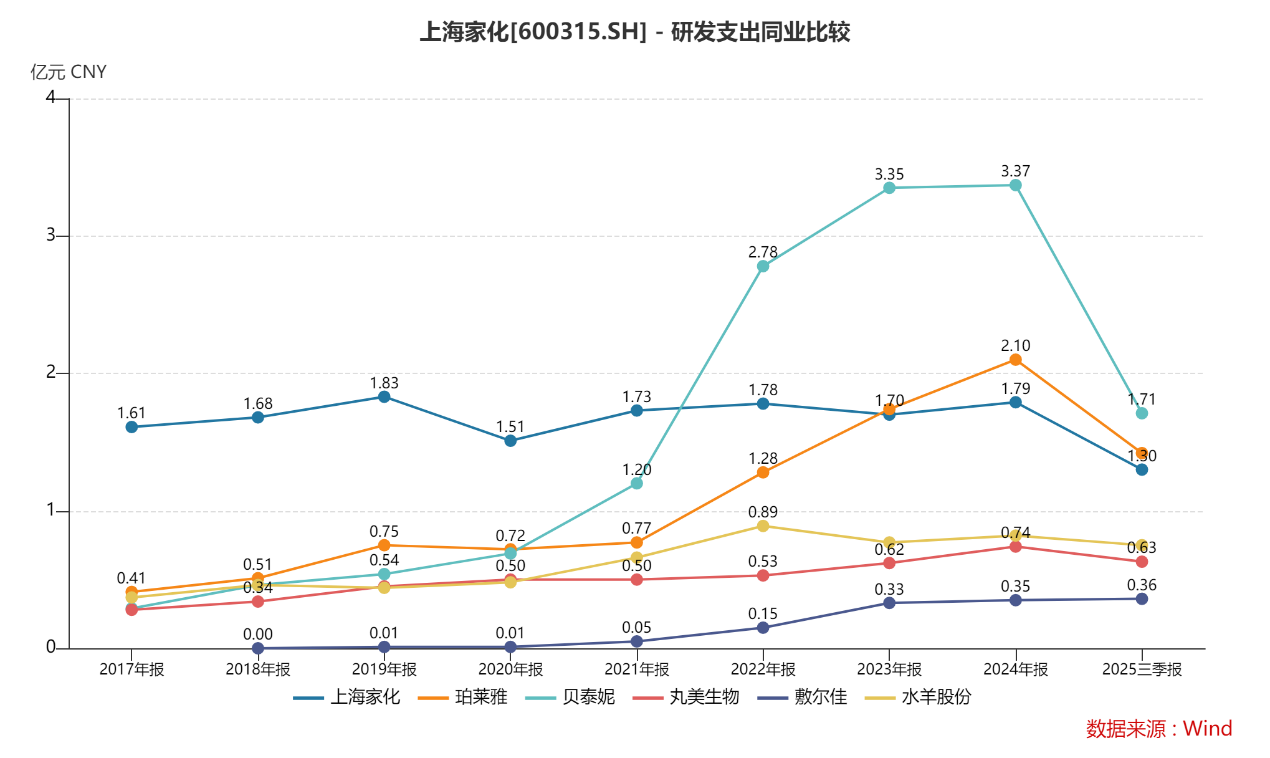 上海家化2018年至2025年前三季度研发支出占营收比重分别是2.35%、2.41%、2.15%、2.26%、2.5%、2.58%、3.15%、2.62%;期间研发支出累计13.32亿元,仅是今年前三季度22.65亿元销售费用的约六成。