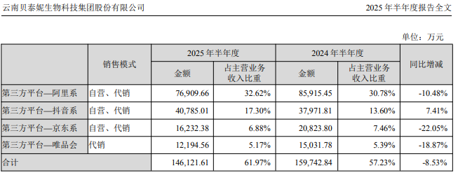 其中,在阿里系、京东系、唯品会和自建平台等线上渠道,贝泰妮收入分别下降10.5%、22.1%、18.9%和16.5%,仅抖音平台增长7.41%。