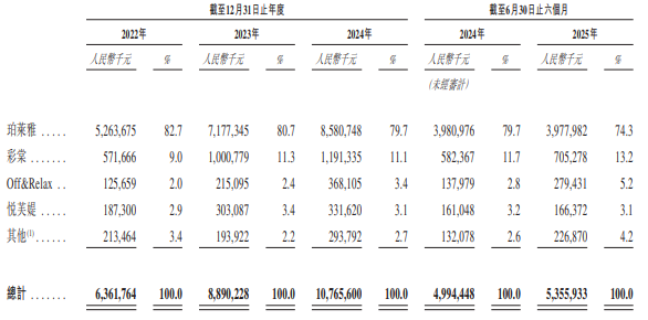 洗护品牌Off&Relax给珀莱雅带来的收入从2022年的1.3亿元增至2024年的3.7亿元,复合年增长率70.9%,2024年占比3.42%,2025年上半年占比增至5.22%。