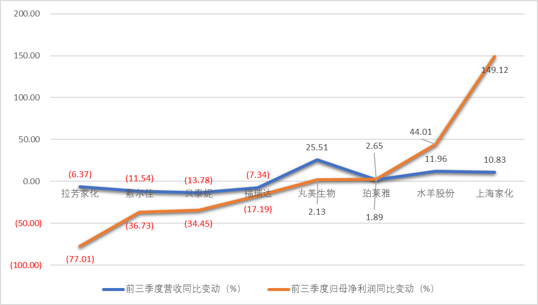 “一哥”珀莱雅罕见地出现单季度营收、净利润双双两位数下滑。拉芳家化、敷尔佳、贝泰妮、福瑞达三季报营收、净利润双双走跌。上海家化、水羊股份实现业绩增长,很大一部分原因去年业绩大跌,丸美生物则是靠对外投资稳住业绩。