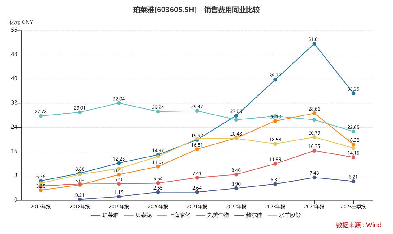 2017年至2024年,珀莱雅销售费用从6.36亿元持续提升至51.61亿元,占总营收比重从35.67%增长至47.88%。2025年前三季度,公司销售费用35.25亿元,占总营收比重近50%。