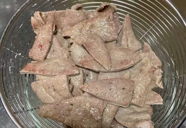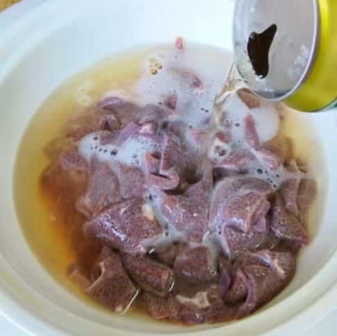 泡好别急着热油!还有第二个“隐藏步骤”——“过温清水”。把泡好的肝片捞出来,用30℃左右的温水冲一遍,温度太高会提前烫熟,太低又冲不掉残留的奶腥,30℃刚刚好,手感“不凉不烫”就行。冲完轻轻挤水,别使劲攥,肝片已经很脆弱,一攥就碎。接着进入“上浆锁嫩”环节:加少许盐、一点点糖提鲜、半勺白胡椒粉,先抓匀,再分两到三次加入红薯淀粉,每次加完都抓至“黏手”,最后封一勺食用油,形成“防护服”,把水分牢牢摁在肉里。整套流程下来,肝片表面会泛出淡淡的“粉光”,这就是“ready to 炒”的信号!
