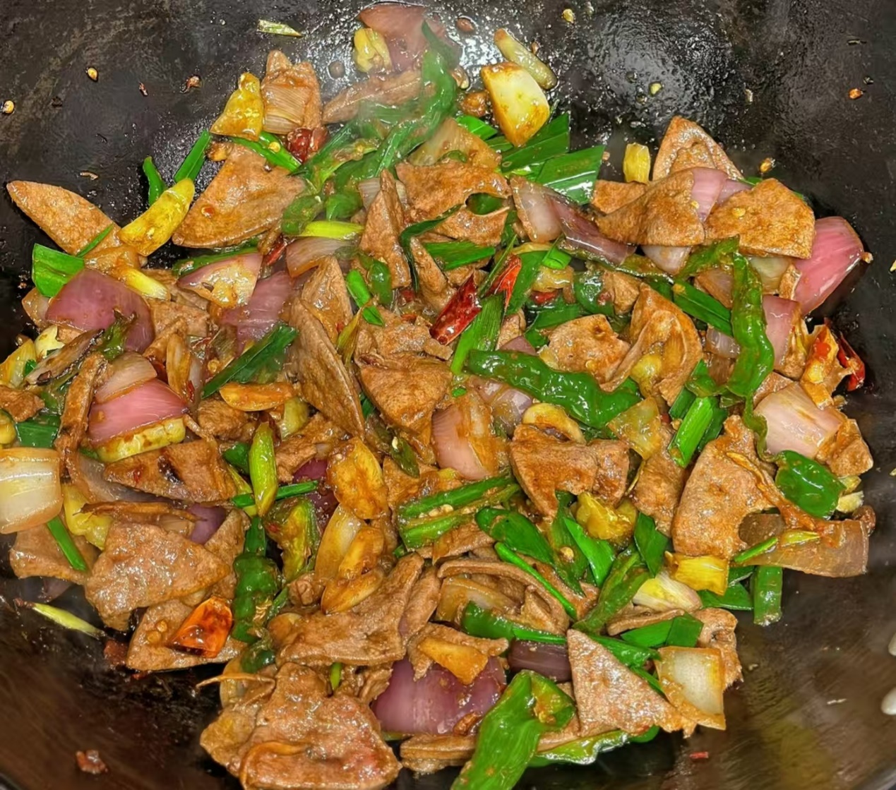 实战开始!锅烧热到冒轻烟,倒油(比平时炒菜多一半),大火!大火!大火!油纹一出现,先下姜蒜片、泡椒圈(不吃辣换洋葱丝),香味“嘭”地炸开,这时候才轮到肝片登场。注意:别一次性全倒!沿着锅边“滑”入,筷子快速划散,动作要快,姿势要帅,10秒定型立即捞出——这时候肝片表面变色,里面还带点粉,像“七分熟牛排”,千万别犹豫。锅里留底油,把彩椒块、木耳丝扔进去,炒五下,提前调好的“快炒碗汁”淋一圈(两勺生抽、半勺老抽、半勺糖、三勺清水、几滴香醋提味),肝片回锅,大火掂锅十秒,让酱汁均匀裹住每片“小月牙”,最后撒盐、淋香油,关火!全程不超过90秒,厨房小白也能hold住。