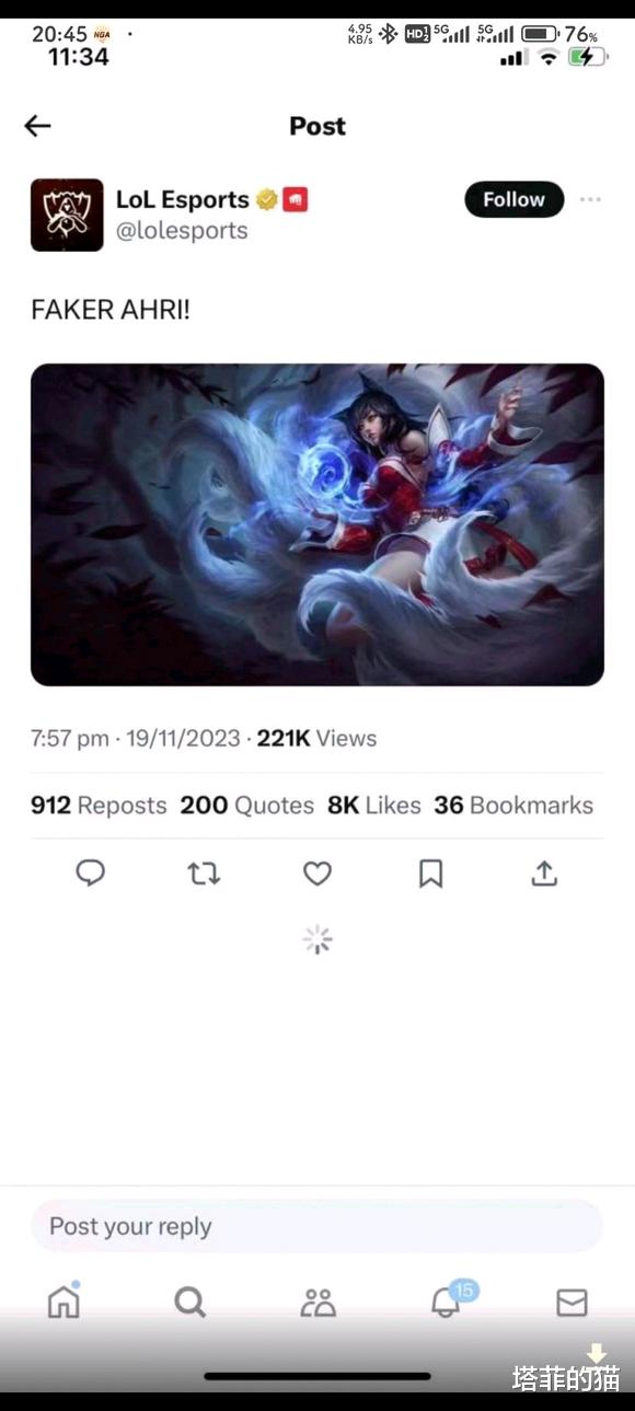 随后LOL官方推特账号就发布了一张阿狸的图片,我想懂的都懂,明年我们就能看到Faker和他的结发夫妻阿狸的冠军皮肤了,阿狸等了十年终于要穿上凤袍了,这回是Faker名门正娶把阿狸接回家了,当年S3的时候其实Faker就想选阿狸当做冠军皮肤,但是拳头劝他说劫的销量会更好,年轻的Faker选择了劫,结果阿狸就等了十年啊。阿狸马上凤袍加身了,十年了,他还是忘不掉她,Faker也兑现了当年给阿狸的承诺,如果我再次夺冠,那么一定会给你一个冠军皮肤。