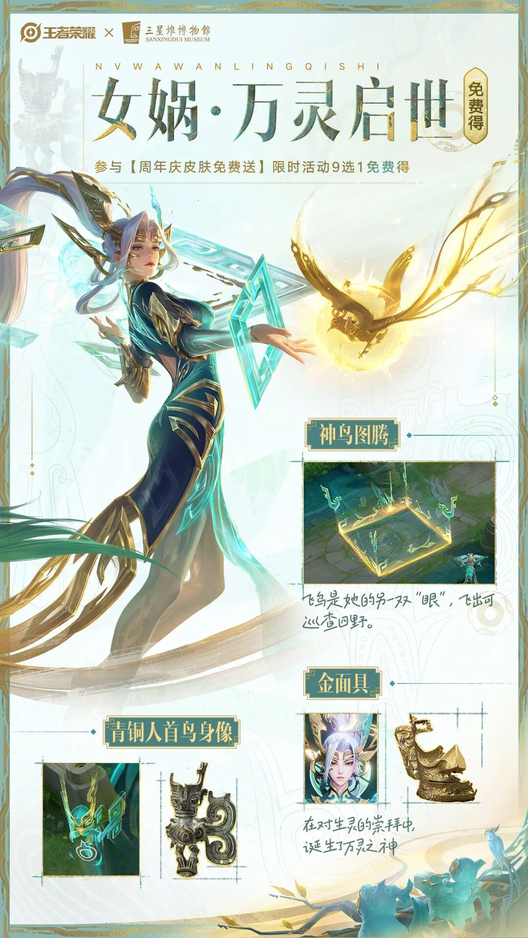 第二款是女娲的【万灵启世】,史诗品质,王者荣耀十周年限定皮肤,下图是皮肤海报。海报中有很多三星堆的元素。