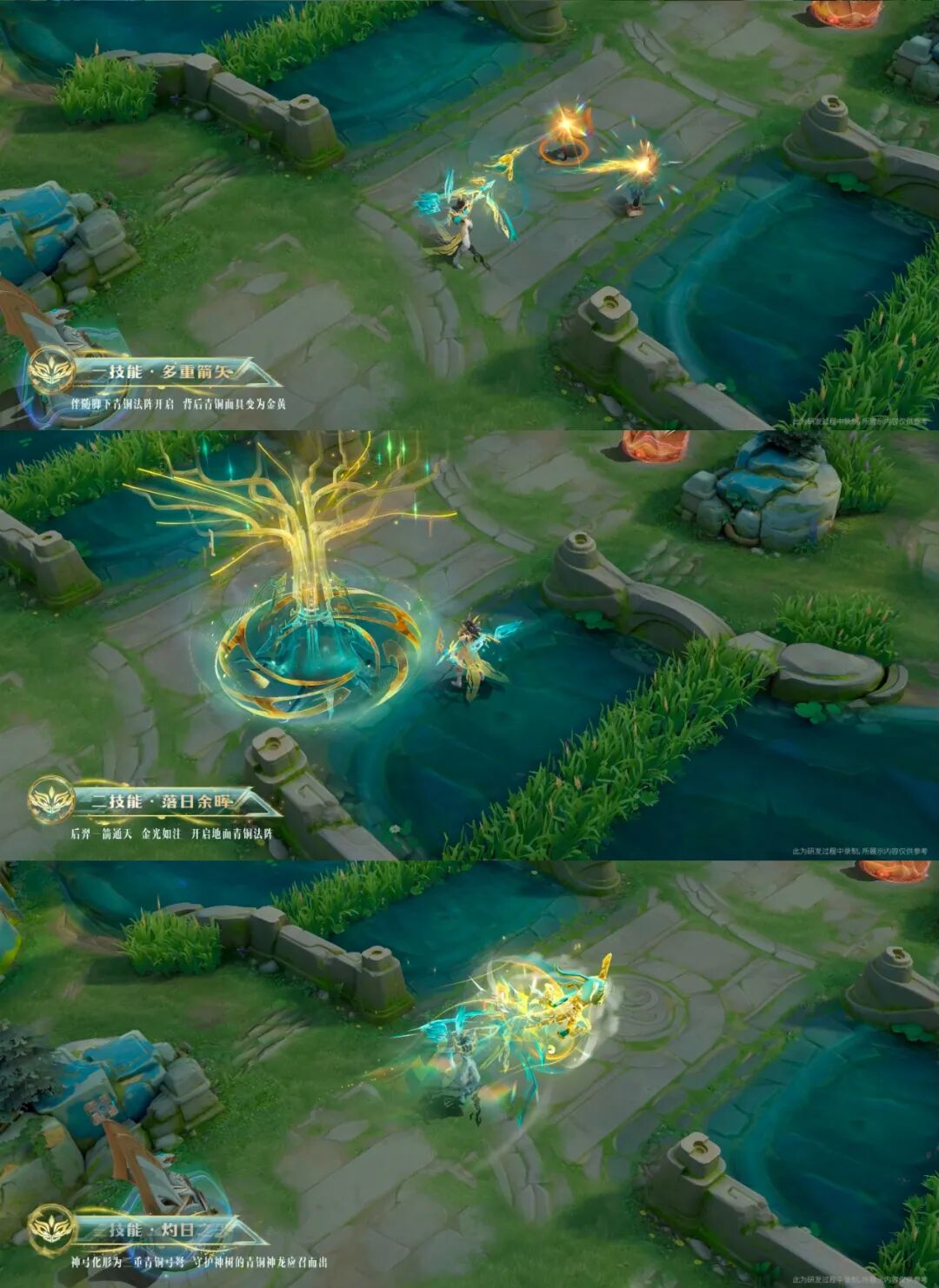 技能配色也是延续了三星堆的元素,有类似黄金青铜的色调。二技能果然是出现了神树。就是大招看上去飞的有点慢。