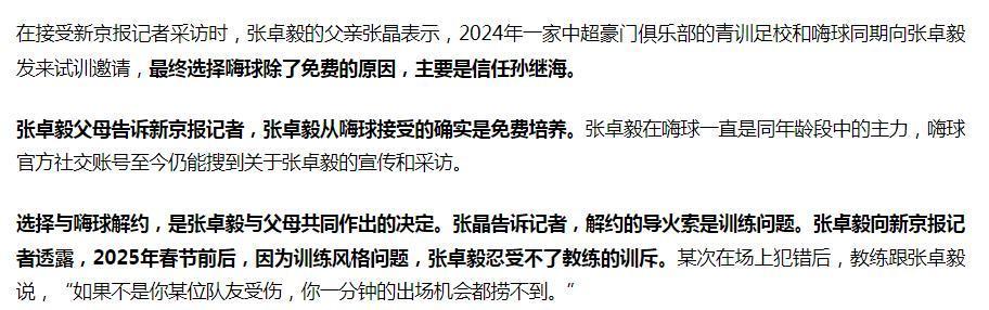 张卓毅在嗨球一直是同年龄段中的主力,嗨球官方社交账号至今仍能搜到关于张卓毅的宣传和采访。 “如果不是你某位队友受伤,你一分钟的出场机会都捞不到。 这前后矛盾的表态家长怎么好意思编的?踢了一年的主力就春节前后突然就接受不了训练方式了?