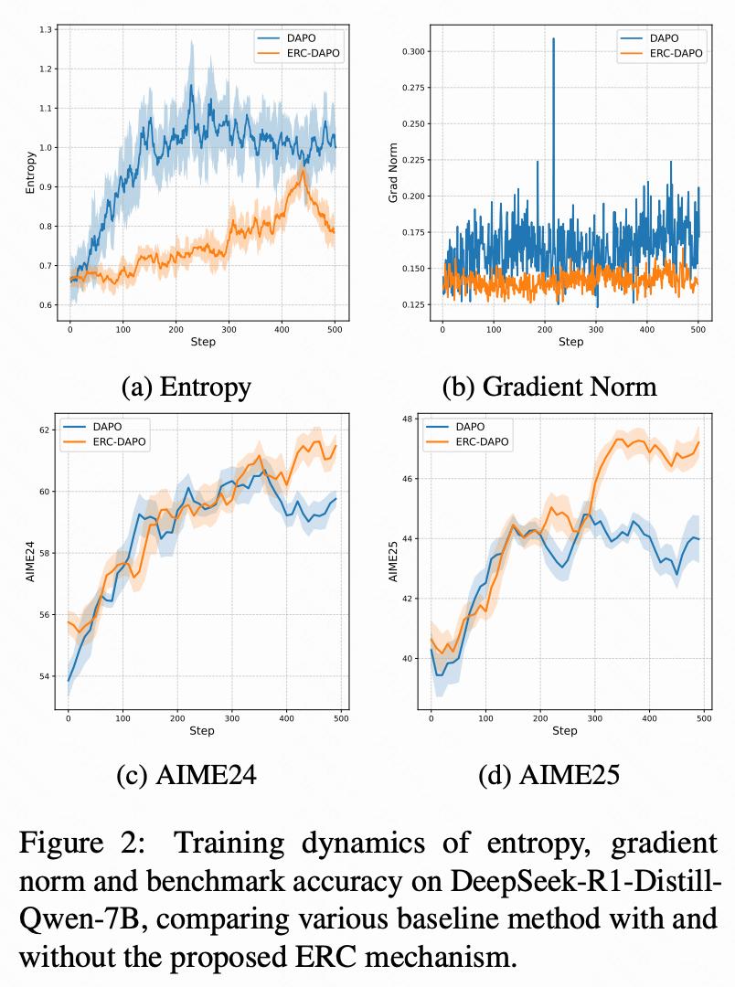 与现有的 RL 基线方法相比,集成 ERC 后,模型几乎在所有基准测试上的性能都得到了一致提升。值得注意的是,在 AIME25 和 HMMT25 等更具挑战性的基准上,性能增益更为显著,凸显了 ERC 在复杂推理场景中的强大潜力。此外,该方法在 1.5B 和 7B 两种参数规模上均取得了一致的改进,进一步证明了其在不同模型容量下的鲁棒性和可扩展性。