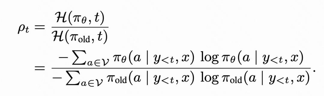 首先,论文提出了熵比指标,其被定义为新旧策略在同一 token 上熵的相对变化。具体的,它被形式化定义为下式: