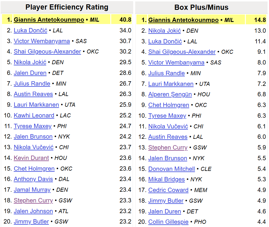——本场比赛之前,字母哥本赛季的PER值达到了恐怖的40.77,在NBA历史上,单季PER值最高的是约基奇32.85(2021-22赛季),本赛季东契奇发挥如此炸裂,暂时也只有33.99,与字母哥有不小差距