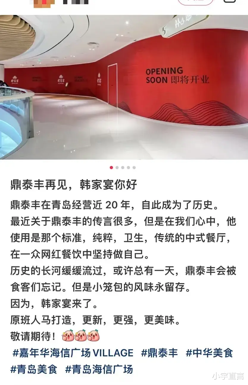 无独有偶,有用户在社交平台上发布的招牌显示,位于青岛原鼎泰丰(嘉年华•海信广场VILLAGE店)的围挡上也写着韩家宴的字样,并配文“原班人马”打造。