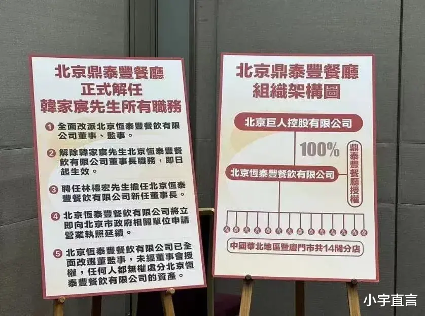 据了解,就在10月22日,巨人控股召开过一次股东临时会。根据中时新闻网报道,巨人控股表示,今年8月26日,韩家宸宣布,鼎泰丰华北14家门店关闭,此事未经恒泰丰董事会讨论,亦未向控股股东巨人报准。孙铁汉决定对韩家宸的不正当经营采取必要的举措,临时股东会议上,宣布解除韩家宸恒泰丰董事长职务,即日起生效,聘任林礼宏为新任董事长。