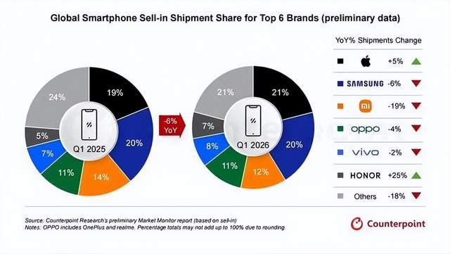 在此背景下,荣耀与苹果成为头部阵营中唯二的 “逆行者”。荣耀以 25% 的同比增幅领跑,成为唯一正增长的安卓厂商,其全球化扩张与本地化产品策略成效显著,在东南亚、欧洲等市场快速渗透,同时通过精准的区域定价与产品组合,有效对冲成本压力。苹果则凭借 iPhone 17 系列需求、供应链优势及生态粘性,出货量增长 5%,以 21% 的市场份额首次登顶季度全球榜首。
