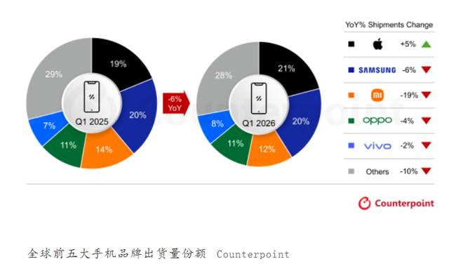 2026年第一季度,全球智能手机市场迎来 “倒春寒”。Counterpoint 最新报告显示,全球出货量同比下滑 6%,创下近三年季度最大跌幅,存储芯片短缺、成本上涨与消费信心低迷成为核心诱因。存储厂商优先将产能投向 AI 数据中心,导致 DRAM、NAND 芯片价格三个月内暴涨超 300%,手机存储成本占比从 10%-20% 飙升至 30%-40%,直接挤压厂商利润并推高终端售价,入门级市场首当其冲,200 美元以下机型出货量暴跌超 30%。