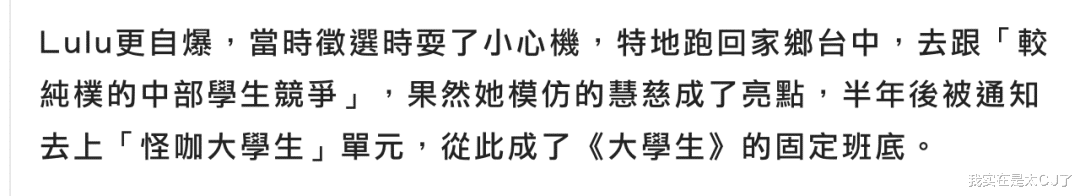 上面这几段描述也能看出来,黄路梓茵和陈汉典虽然都是草根励志系,但陈汉典是被命运推着走的人,而黄路梓茵有野心有行动力,主打一个“Lulu想要,Lulu得到”。所以当她崇拜的陶晶莹主持的《大学生了没》要在全台范围选拔新班底,黄路梓茵没在上学的双北地区参选,而是跑回了台中老家搞降维打击。