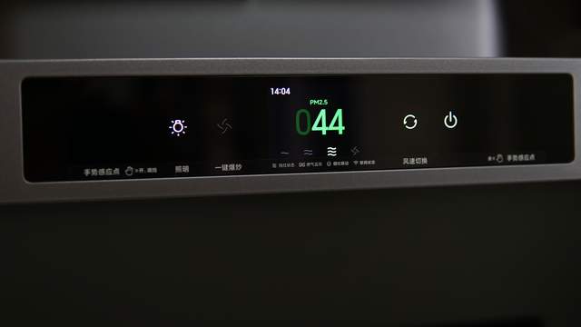 米家智能净烟机Pro的顶部可以显示时间,也依旧可以显示PM2.5显示,只不过它数值升级成了彩色,不同色彩代表不同污染程度,一看就很直观,老人也能看懂。