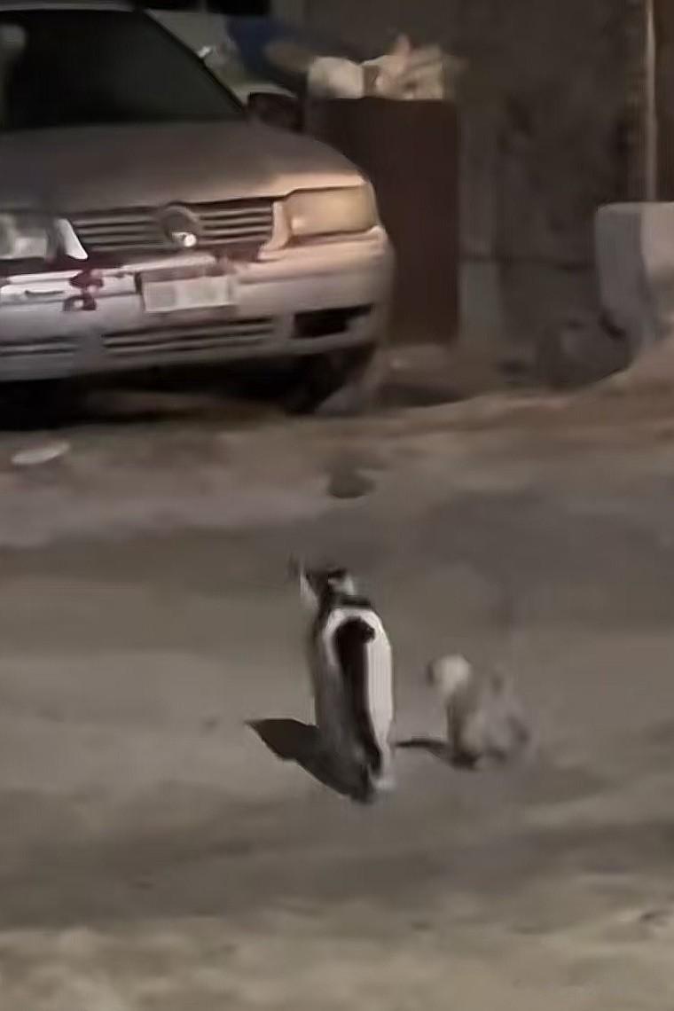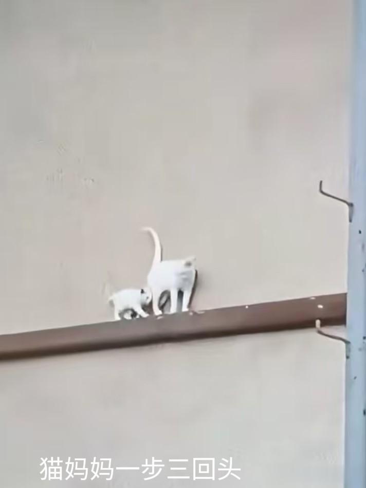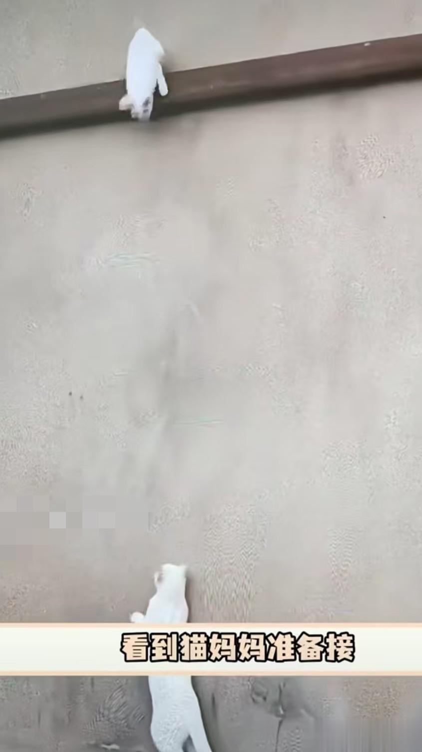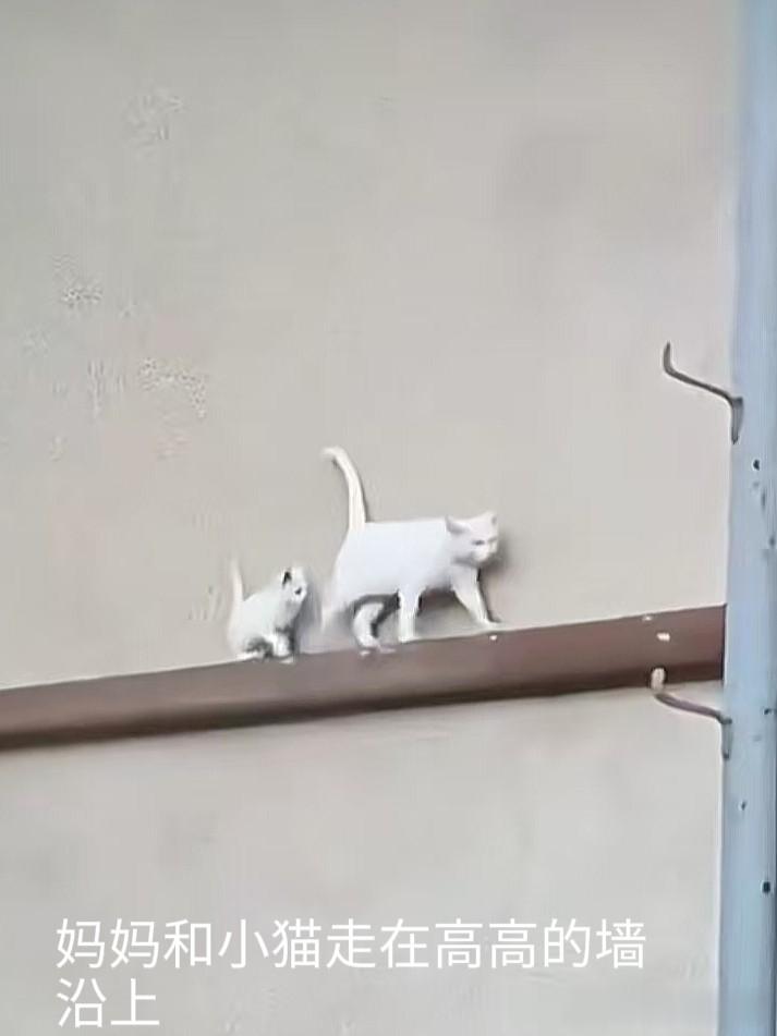 到了墙沿边,猫妈妈率先轻盈跳下,做出示范,小猫见状,也鼓足勇气纵身一跃,而猫妈妈早已在下方稳稳地接住了它。