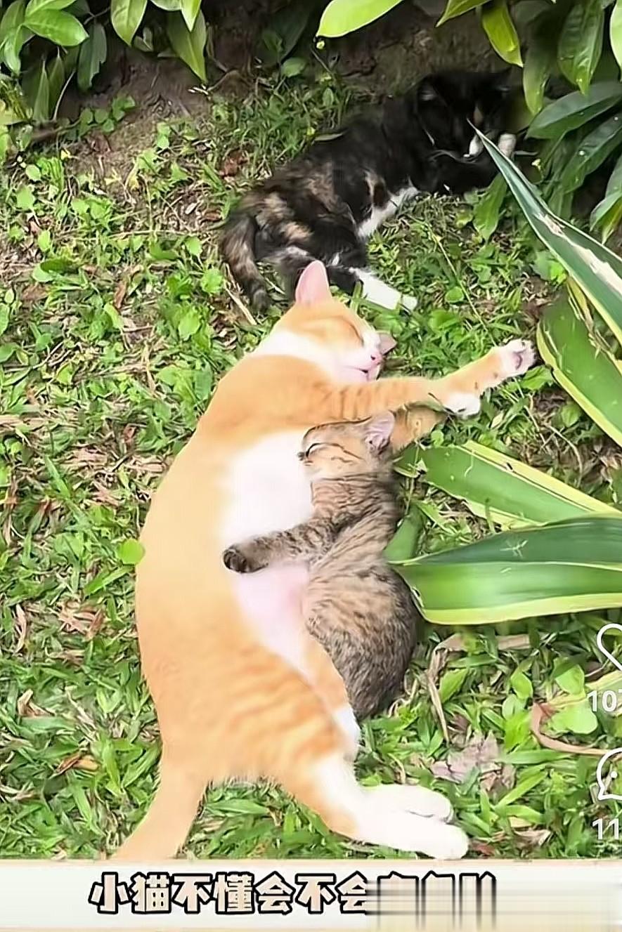 看那橘色的猫妈妈,惬意的卧在草地上,小猫亲昵的卧在它怀里。