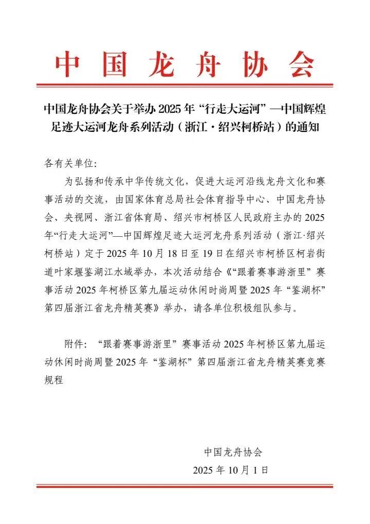 中国龙舟协会关于举办2025年“行走大运河”—中国辉煌足迹大运河龙舟系列活动(浙江·绍兴柯桥站)的通知