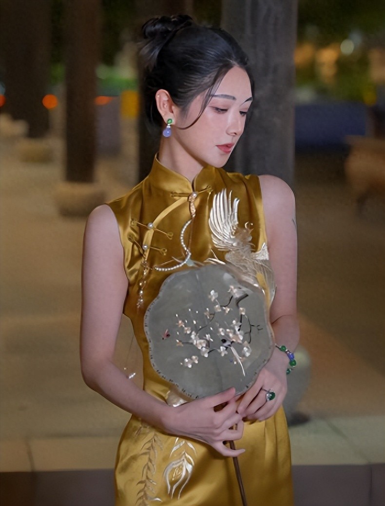 青石板路面配小桥流水人家的古朴氛围,罗扇轻摇,薇娅身穿一袭立领暗纹黄色无袖旗袍,搭配盘扣和刺绣元素,完全不是刻意凹造型的样子,既符合乌镇的文化背景,又兼顾了时尚感与舒适度。