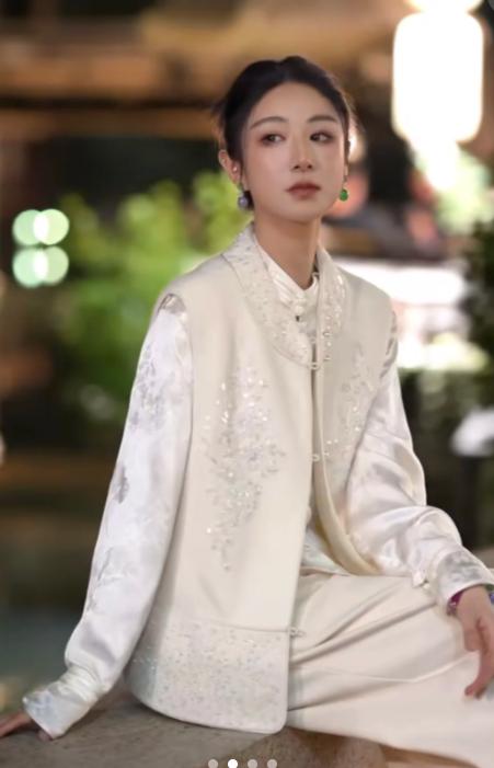 薇娅身着米白色新中式套装,立领盘扣缀,这身造型既保留了江南水乡的邻家妹子的韵味,又通过现代剪裁凸显“温婉如水”、“贵气典雅”气质。