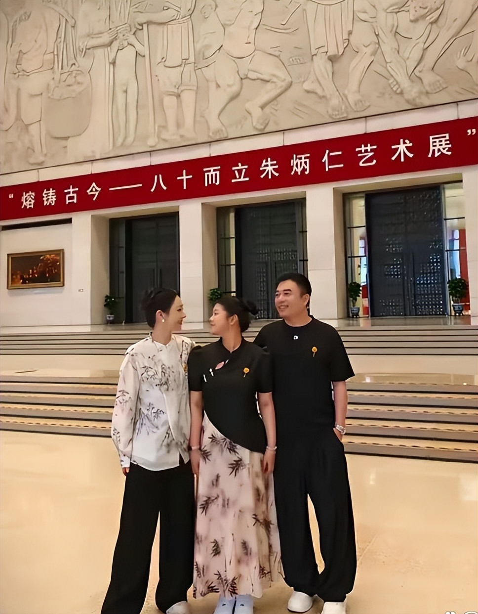 在陪同女儿参观朱炳仁大师的熔铜艺术展的时候,薇娅非常用心地选择了宛如水墨画的上衣配黑色阔腿长裤。