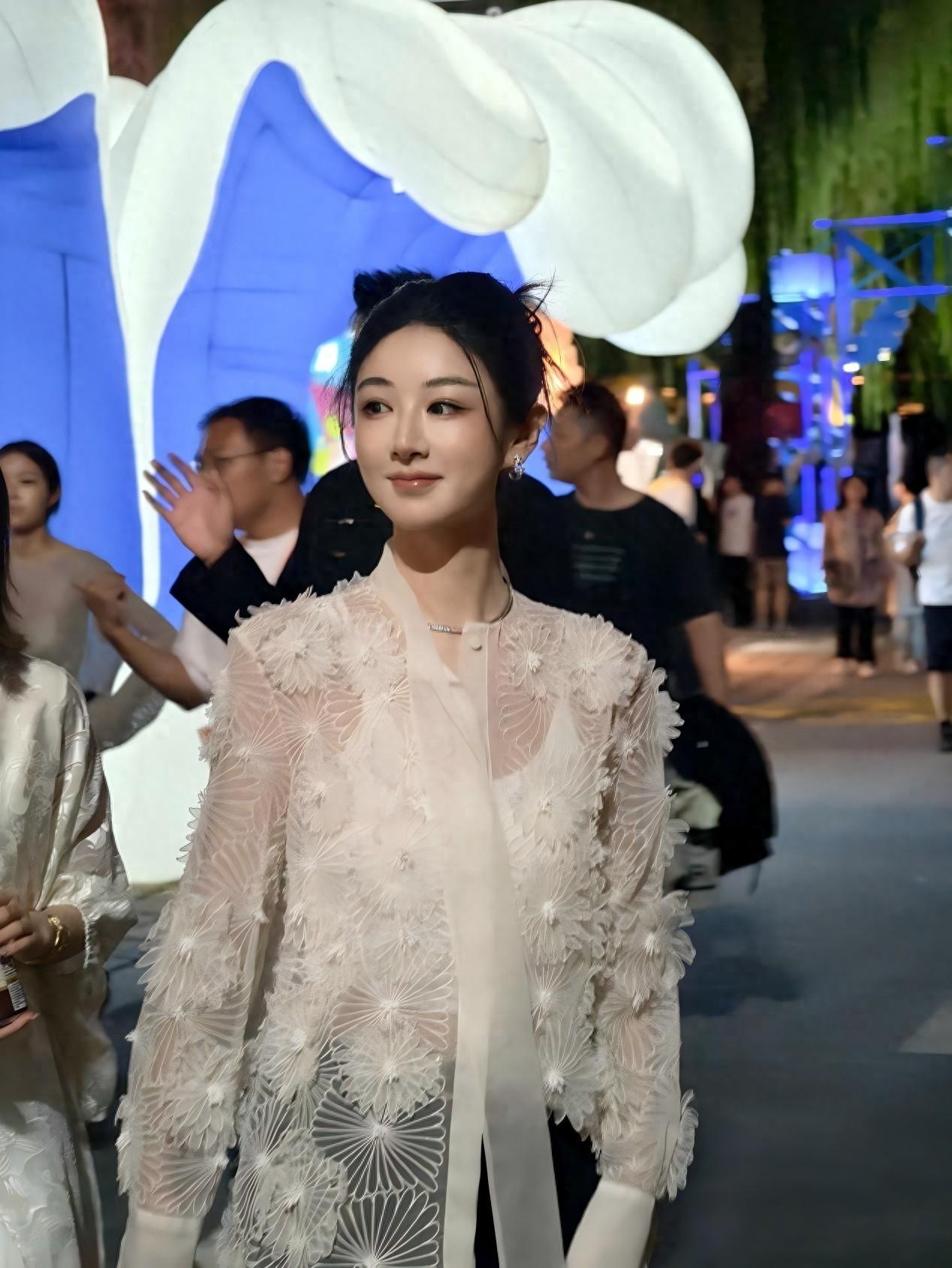 那深浅不一、意境悠远的图案,自带水墨晕染的意境,仿佛将中国传统的山水画穿在了身上。不仅与艺术展禅风古韵的风格很搭,还展示了她对中国传统艺术的深刻理解与尊重。
