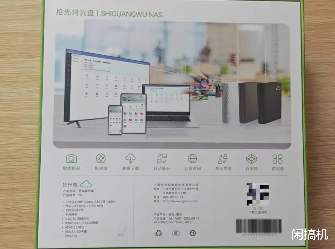 拾光坞N3包装盒背面就印着详细配置,它搭载了瑞芯微RK3566处理器与Mali G52 GPU,标配2GB的DDR4内存与算力1Tops的独立NPU,可以加强图像和视频处理能力,比一般单盘位NAS要强。